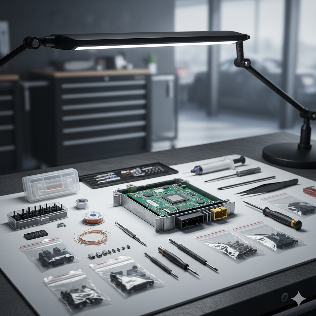 ECU Tamir Kiti, motor beyni (ECU) üzerinde sık karşılaşılan elektronik arızaların onarımı için özel olarak hazırlanmış profesyonel bir settir. Kit içerisinde, ECU devrelerinde zamanla oluşan lehim çatlakları, sinyal kesintileri ve elektronik bileşen arızalarının giderilmesine yönelik gerekli yardımcı ekipman ve sarf malzemeleri bulunur.